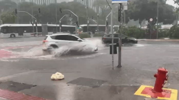 VÍDEO: Avenida vira ‘rio’ e bombeiros abrem carro submerso em busca de vítimas
